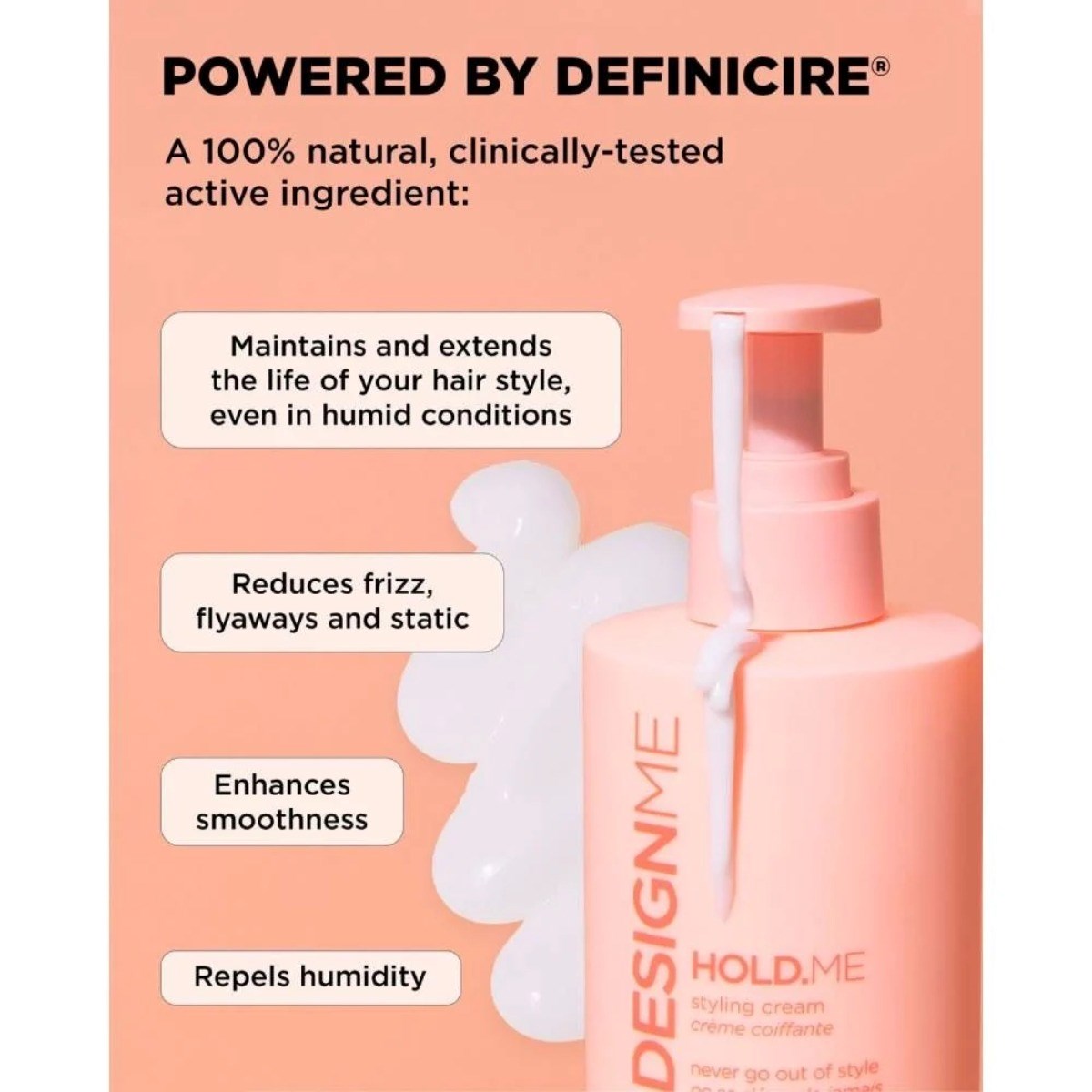Achieve smooth, frizz-free styles with DESIGNME Hold.ME Styling Cream, a multi-tasking cream that hydrates, protects, and enhances shine. Infused with nourishing Aloe Vera and Argan Oil, it delivers weightless softness while shielding hair from humidity and heat up to 400°F. Powered by Definicire technology, this clinically tested, natural ingredient helps lock out frizz, maintain a soft hold, and keep your style polished all day.