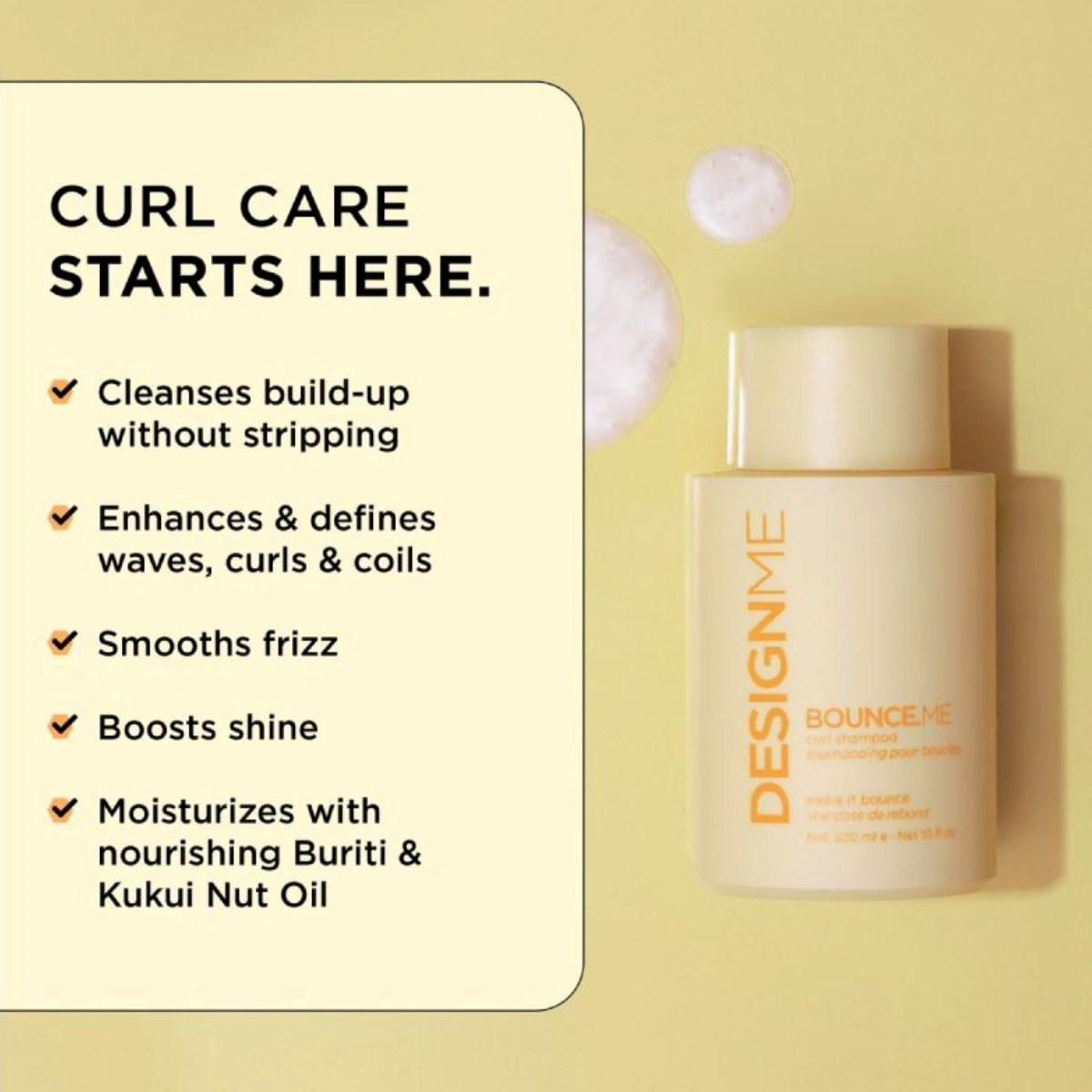 Refresh and enhance your curls with DESIGNME Bounce.ME Curl Shampoo, a curl-boosting formula that cleanses build-up while infusing moisture for soft, frizz-free, and well-defined curls. Enriched with Kukui Nut and Buriti oils, it strengthens hair, hydrates deeply, and improves curl manageability. Perfect for waves, curls, and coils, this shampoo leaves your hair bouncy, healthy, and full of life.