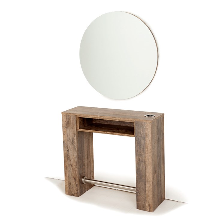 The Mirada Styling Unit offers a sleek and practical design for any professional salon. It features an inset silver dryer holder at the top, convenient storage beneath the worktop, and a robust brushed steel footrest for added durability. The safety-backed circular mirror is pre-bonded to the backboard for easy installation.