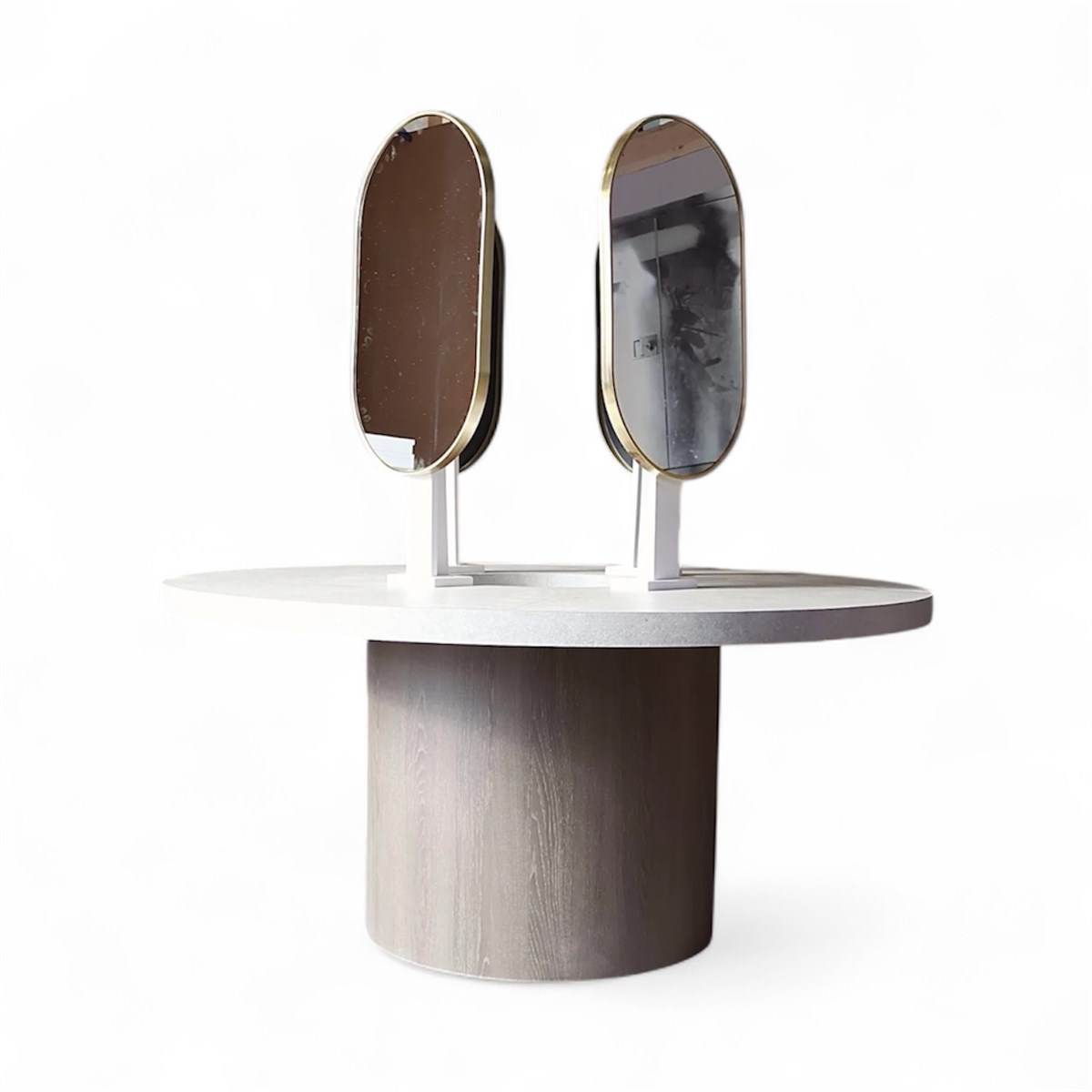 Instantly elevate your salon’s look with our bespoke four station island unit, expertly designed and crafted in the UK. This premium circular station features four hair stylist mirrors and a distinctive curved finish, blending modern style with exceptional functionality. The unique design adds sophistication to any hair salon, barbershop, beauty parlour, or spa, making your workspace both beautiful and practical. Please note the tree is not included.