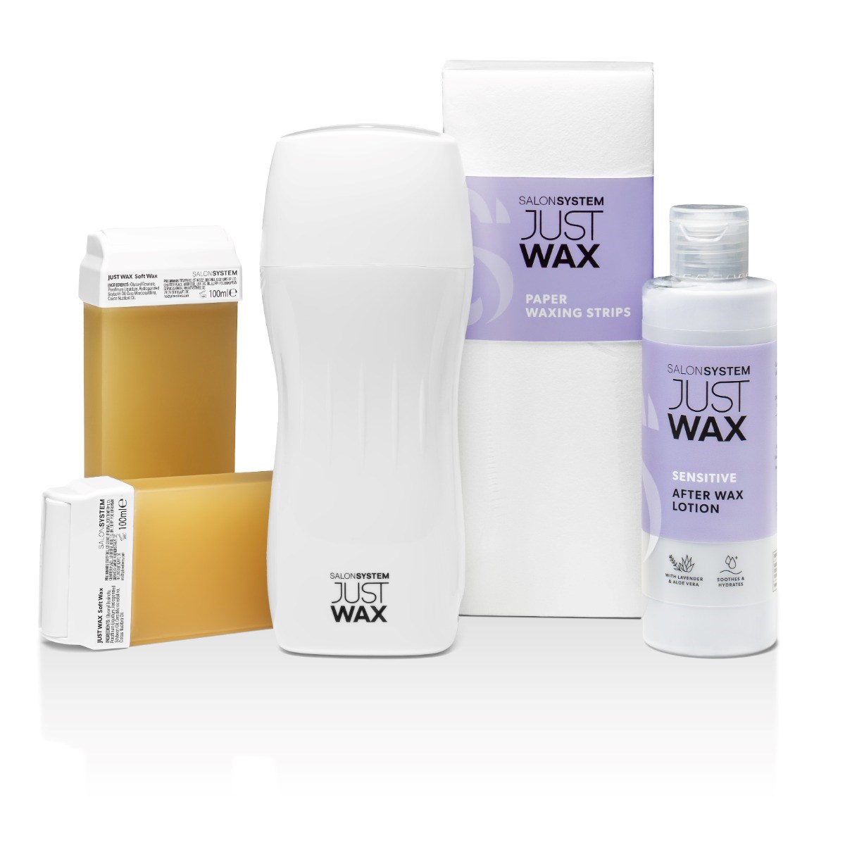 The kit includes a heated cartridge holder, two 100ml roller wax refills, After Wax Lotion (250ml), and a pack of 100 paper waxing strips.