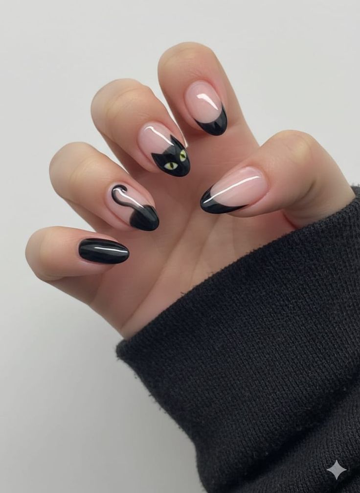 Sleek, subtle and mysterious, black cat nails are the pur-fect choice for Halloween. Whether it’s minimalist cat eyes, a sleek silhouette, or glossy black claws, this nail trend channels major ‘witchy cool-girl’ energy.