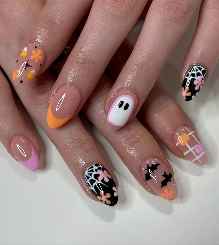 Why choose one design when you can have them all? Mix & match Halloween nails are huge this season, with each nail featuring a different motif, from pumpkins and ghosts to stripes and cats. It’s super playful, creative, and perfect for those indecisive clients!