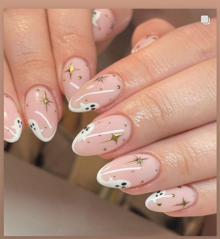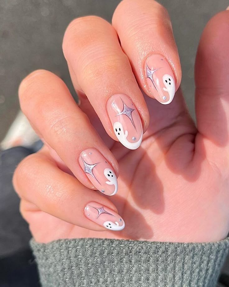Add a touch of magic to your clients' spooky mani with these sparkly ghost nails. These tiny ghosts added to a sheer shimmer base are a super playful yet cute vibe to add to your clients' nails this Halloween season.