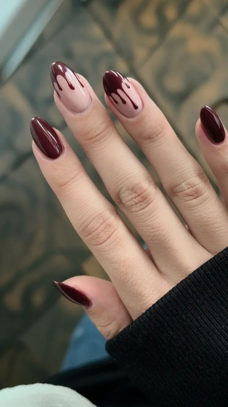 French tips, but with a terrifying twist. The dripping blood tips bring all the drama to your clients' mani, paired with the very on-trend cherry cola colour for that autumnal finish.