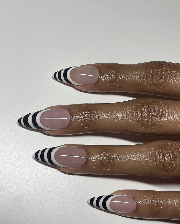 Wednesday Adam’s called, she wants her nails back. Spotted on it-girls, Kylie Jenner and Dua Lipa, Stripey Nails are giving serious cool girl energy this season. Being a modern twist on the classic French mani, use black and white stripes, candy corn colours, or Halloween-inspired patterns across almond-shaped nails for the ultimate stripey tip look.