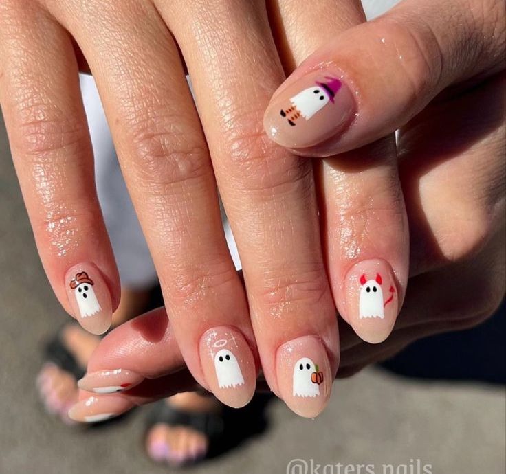 Add a touch of magic to your clients' spooky mani with these sparkly ghost nails. These tiny ghosts added to a sheer shimmer base are a super playful yet cute vibe to add to your clients' nails this Halloween season.
