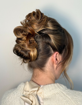 - Loosely place the curls onto the top of the bun, securing with grips whilst leaving the ends out, adding texture to the look.