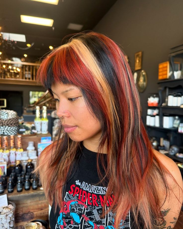 Inspired by the visually unique design of the Calico cat’s fur, this hair trend combines striking colours of reds, such as coppers and auburn, bright blondes, and brown tones in bold slices to mimic the effect. Perfectly paired with layered cuts such as shags, or wispy bangs, the Calico Cat trend is ideal for clients wanting a striking, distinctive and creative look.