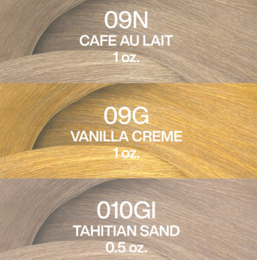 Global Application: Apply the 3 following shades - 30g 09N Café au Lait, 30g 010GI Tahitian, 15g 09G Vanilla Crème, as well as the 75g Processing Solution.