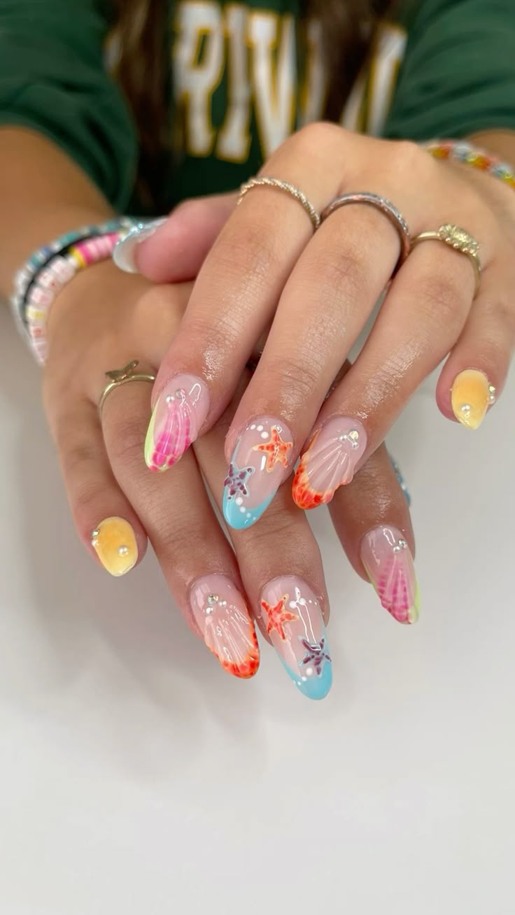 Dive into an ocean-inspired mani this spring with bright and bold colours that reflect the ultimate beach day. Think mermaid vibes, seashells, and starfish with additions of gemstones and pearls for that aquamarine aesthetic.