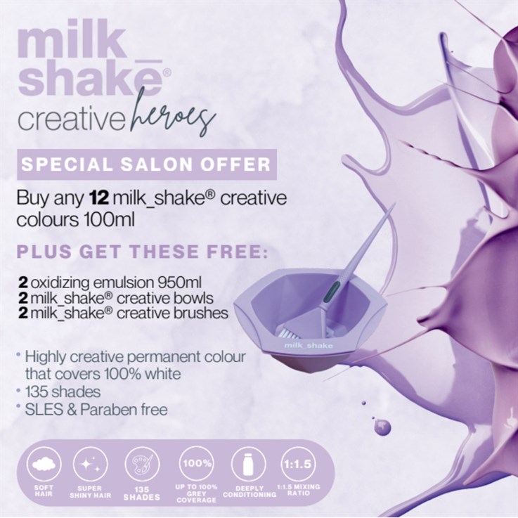 Refresh your colour bar with the ultra-versatile milk_shake creative permanent colour range. When you buy any 12 shades in 100ml, you’ll receive a selection of essential professional tools and developers completely free. This bundle gives your salon everything needed to create vibrant, long-lasting colour results with ease.