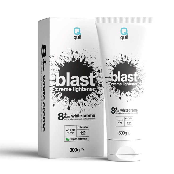 Analyse the hair structure before use. Make the product homogeneous by manipulating the tube from bottom to top for a few minutes. In a non-metallic bowl, mix 1 part Quif Blast Crème Lightener with 2 parts Quif Developer (5 vol 1.5%, 10 vol 3%, 20 vol 6% or 30 vol 9%) until smooth. Do not use hydrogen peroxide above 20 vol 6% on roots. Apply evenly to dry hair and check progress every 5 to 10 minutes. Processing time may vary between 20 and 50 minutes. Do not exceed the maximum processing time. Once the desired lift is achieved, rinse thoroughly, shampoo and condition.