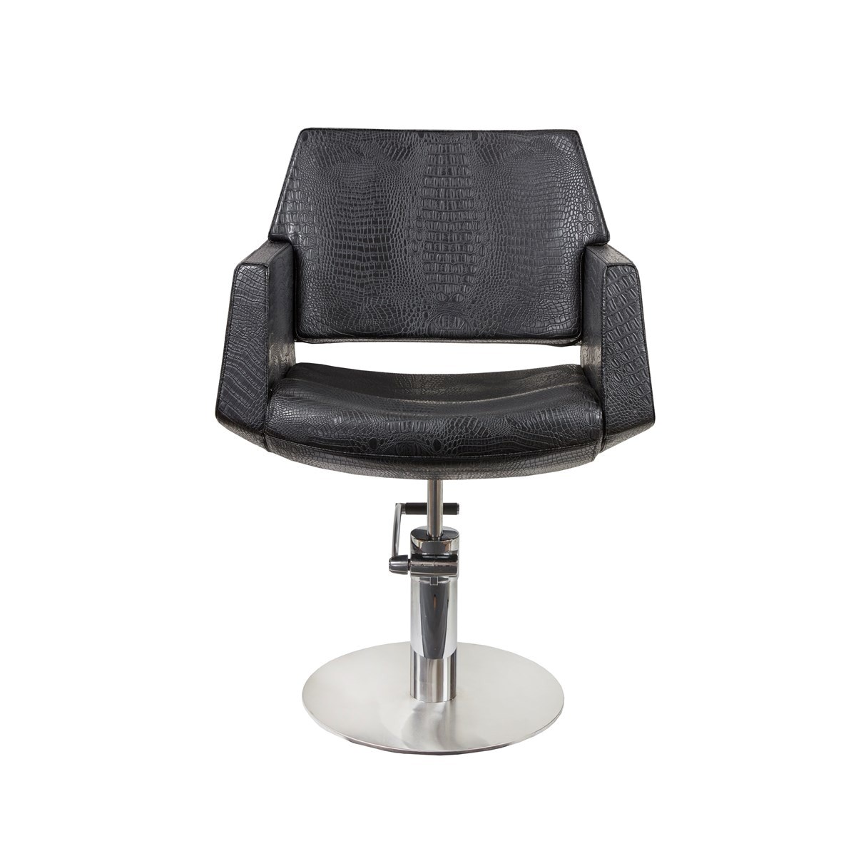 Finished in luxurious Iguana skin black fabric, this chair adds a touch of sophistication to any salon.